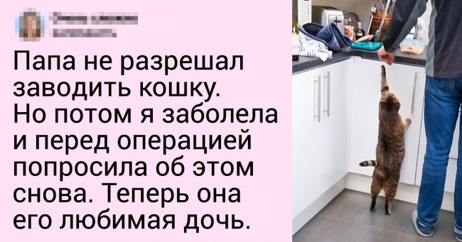 19. «Тато довгий час не дозволяв нам завести вихованця. Кілька років тому я захворіла і попросила перед операцією кішку. Тепер вона його улюблена дочка»
