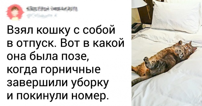 20. «Взяв кішку з собою у відпустку. Ось якою вона була позі, коли покоївки завершили збирання і покинули номер»