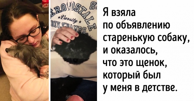 «У дитинстві моя бабуся купила мені цуценя, якого я назвала Хлоєю і любила до нестями. Десь через 4 роки з-за роботи папи нам треба було переїхати в будинок, де не дозволялося мати собак, і ми віддали Хлою в Гуманне суспільство Вашингтона. Я не знала, що з нею сталося потім. Днями я побачила у Facebook оголошення, що старенька собака на ім’я Хлоя шукає новий дім. Я написала авторам, що заберу її, а коли приїхала і довідалася, де вони взяли її, то виявилося, що ця родина забрала цуценя з Гуманного суспільства приблизно тоді, коли ми її віддали. У ветеринарній клініці ми перевірили чіпи, і це точно моя собака!»