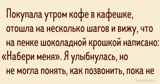 - Купувала вранці кави в кав’ярні, відійшла на кілька кроків і бачу, що на пінці шоколадною крихтою написано: «Набери мене». Я посміхнулася, але не могла зрозуміти, як зателефонувати, поки не випила кави. На дні склянки був написаний його номер. Самий шикарний і милий підкат за все моє життя.