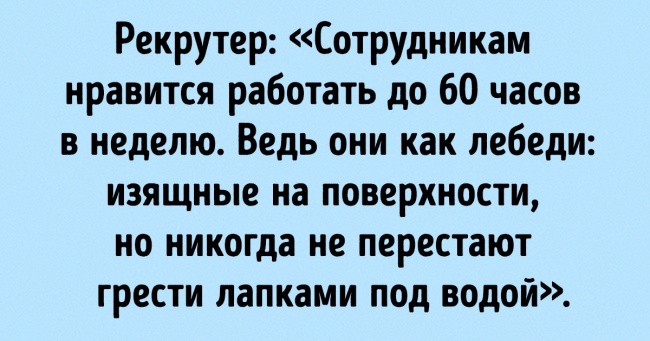 - Коли очікується нездоровий баланс між роботою і особистим життям. На одному з співбесід рекрутер сказав мені що-то на кшталт: «37 годин на тиждень — це стандарт, але нашим працівникам подобається проводити тут до 60 годин в тиждень. Деякі працюють по суботах». «Наші працівники як лебеді: витончені на поверхні, але ніколи не перестають гребти лапками під водою». Ні, хлопці, я не хочу вигоріти до 32 років.